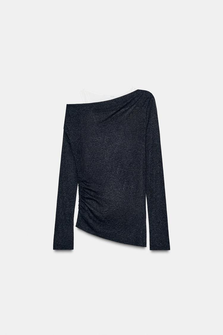 Bisiklet yaka, uzun kollu t-shirt. Kontrast çift t-shirt görünümlü kombin kumaş detaylı.