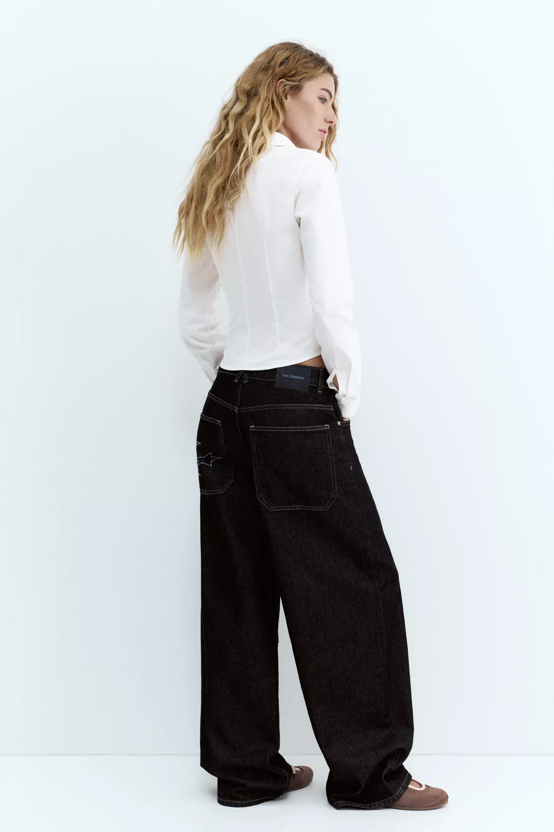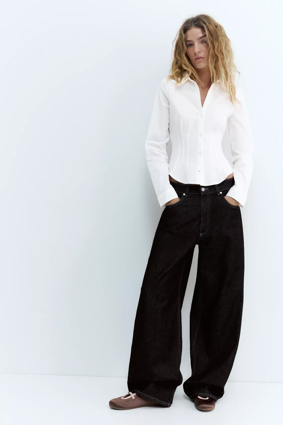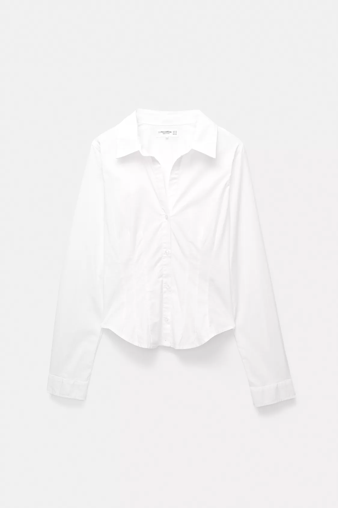 Düğme kapamalı, yırtmaç detaylı ve poplin kumaştan uzun kollu dar kesim gömlek.