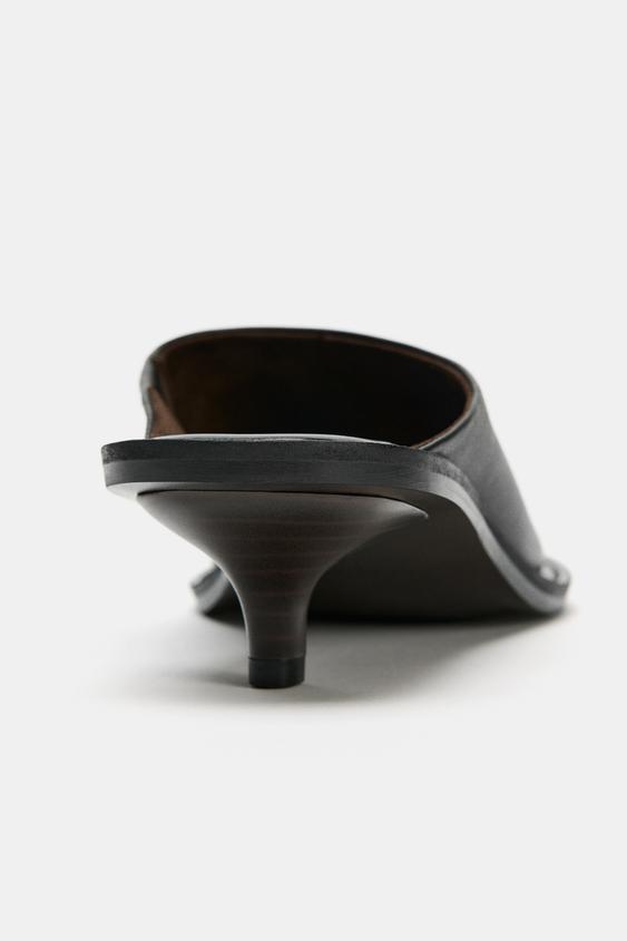 Deri sandalet. Arkası açık ayakkabı tarzı. Geniş ön bant. Kısa sivri topuklu. Yuvarlak burunlu.