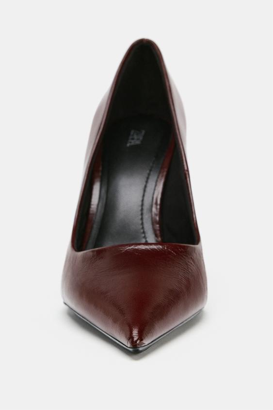 Topuklu deri ayakkabı. Yuvarlak kesim. İnce yüksek topuklu. Sivri burun.