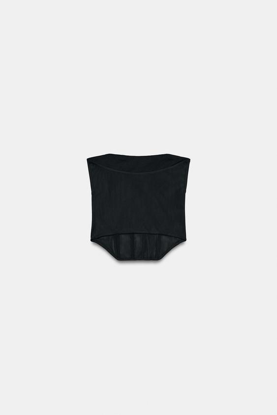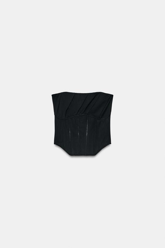 Düz yaka, açık omuzlu korse. Göğüs kısmı drapeli kumaş. Balen detaylı. Asimetrik etek ucu. Arkadan kapanır.