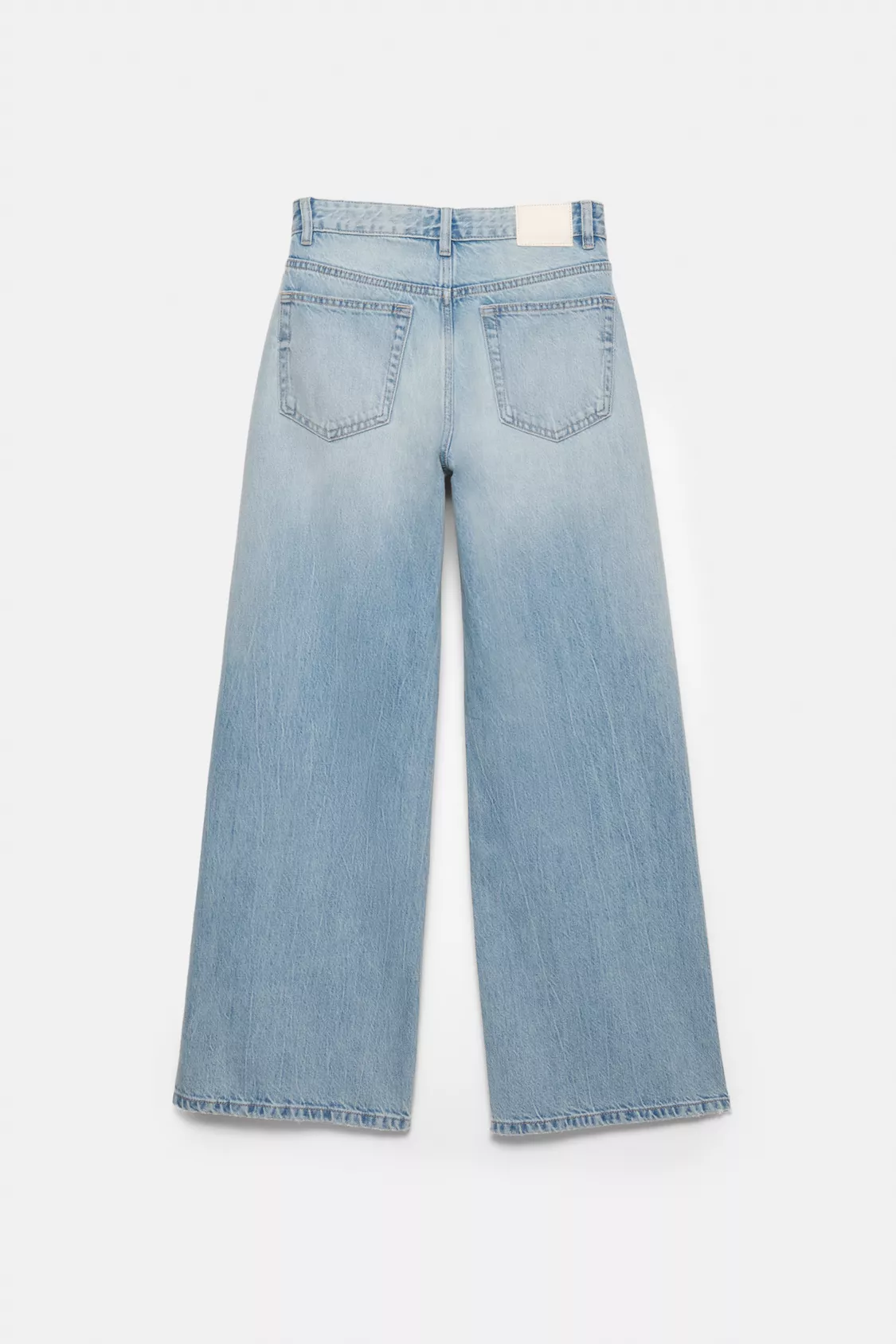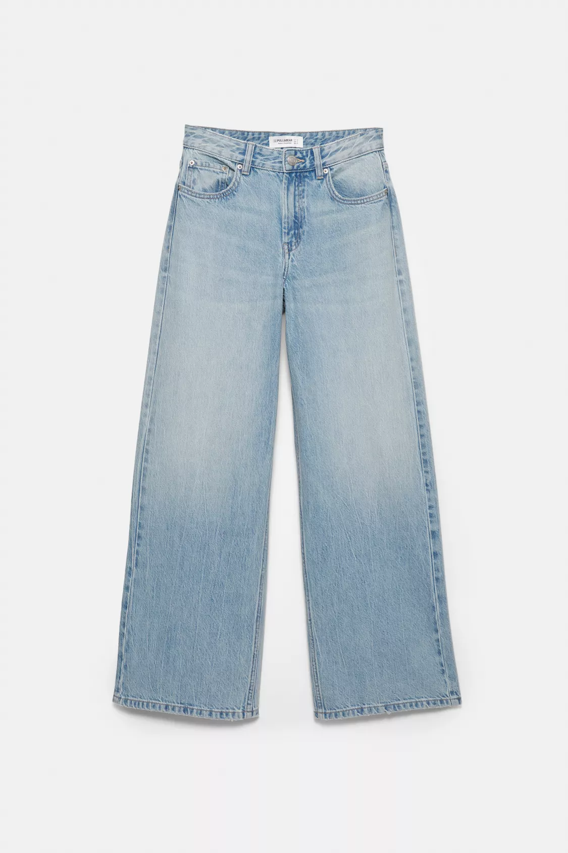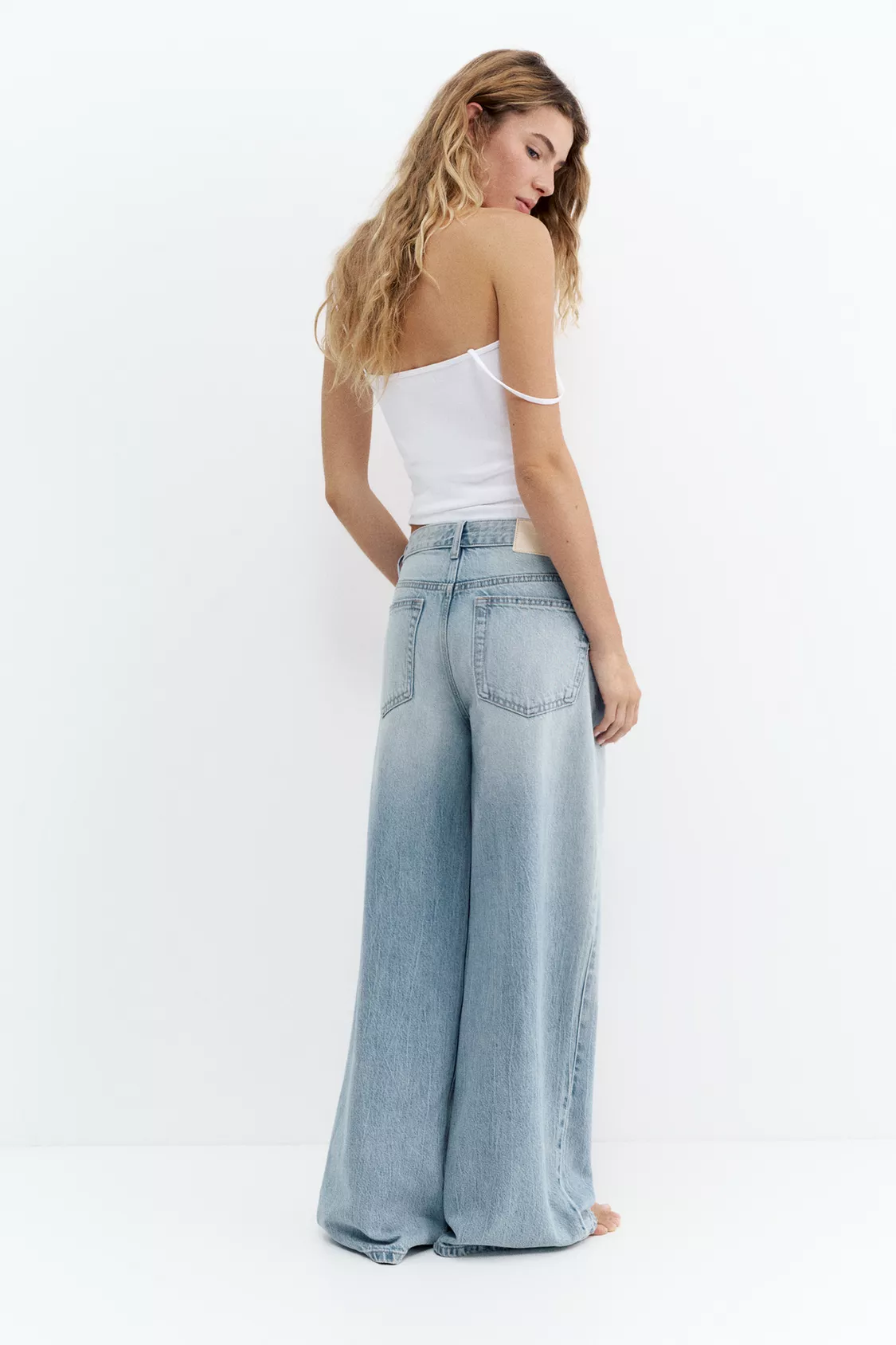 Düşük bel, kemer tokalı, fermuarlı ve düğmeli, cepli oversize baggy jean.