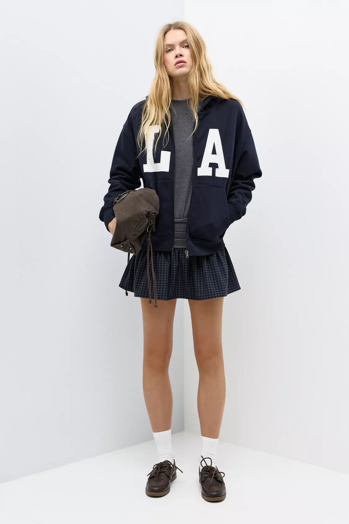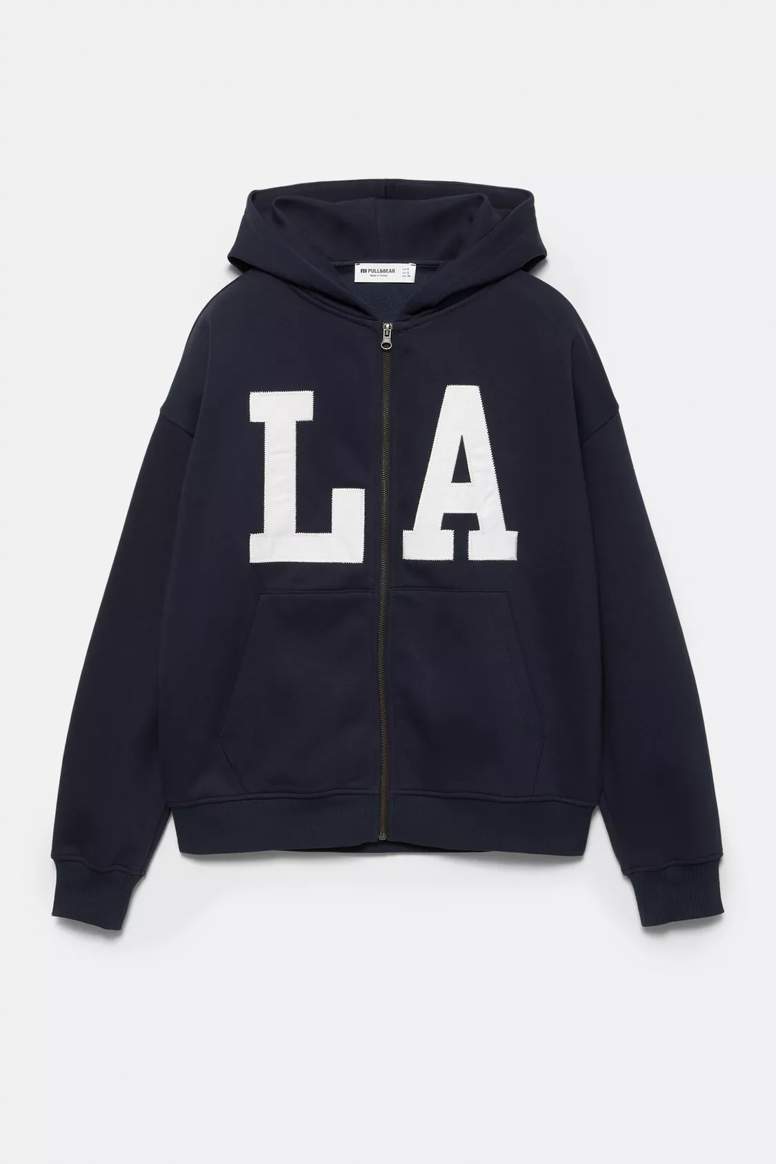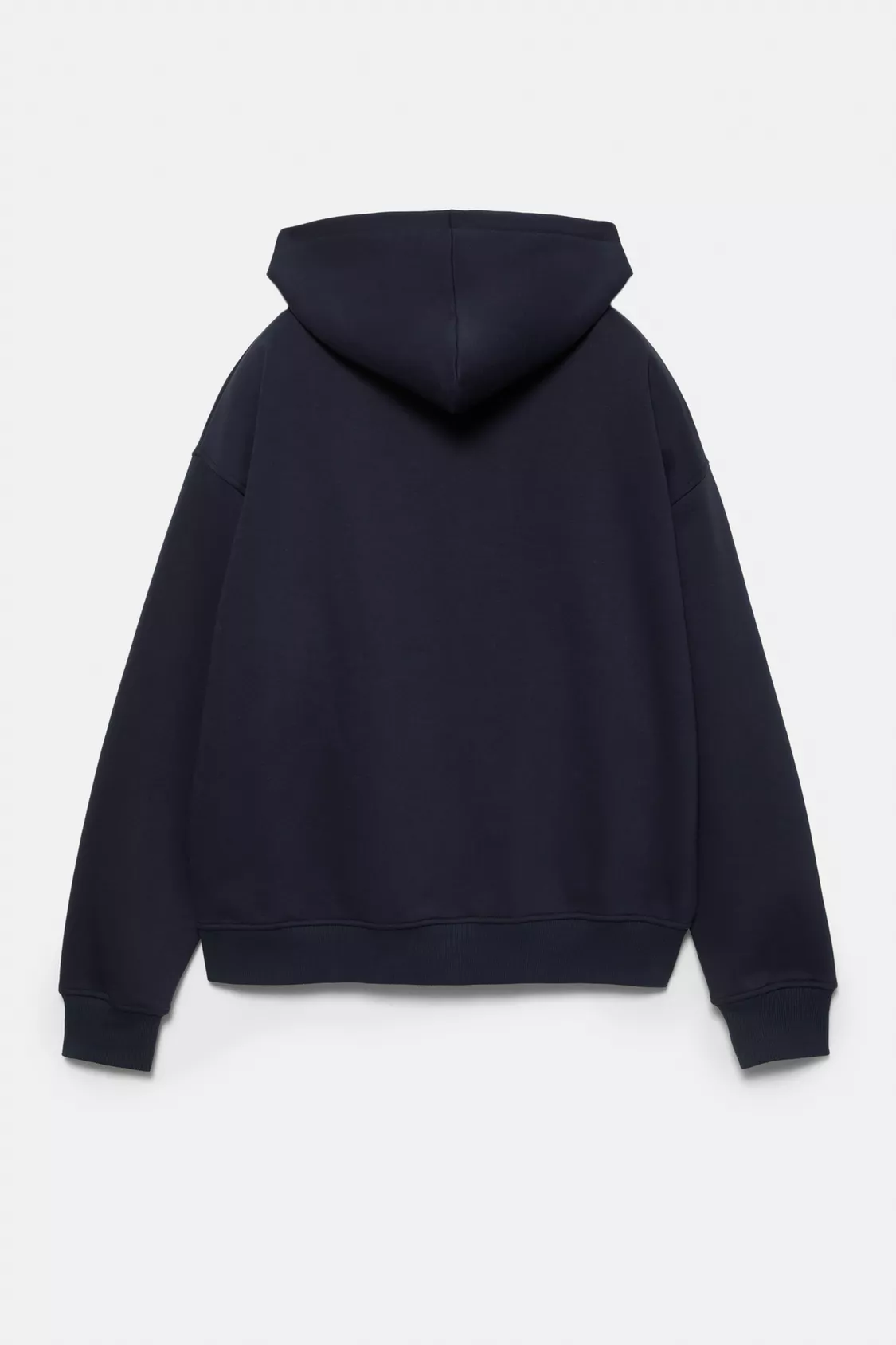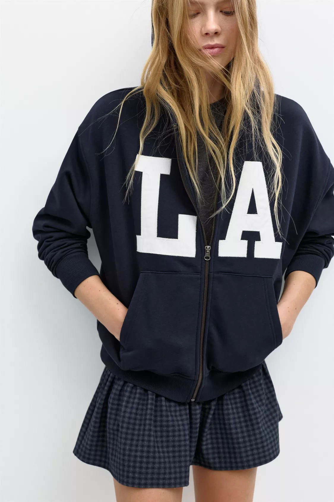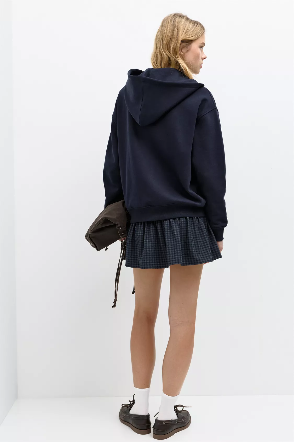 Kapüşonlu, fermuarlı, önde nakışlı, kanguru cepli ve uzun kollu sweatshirt.