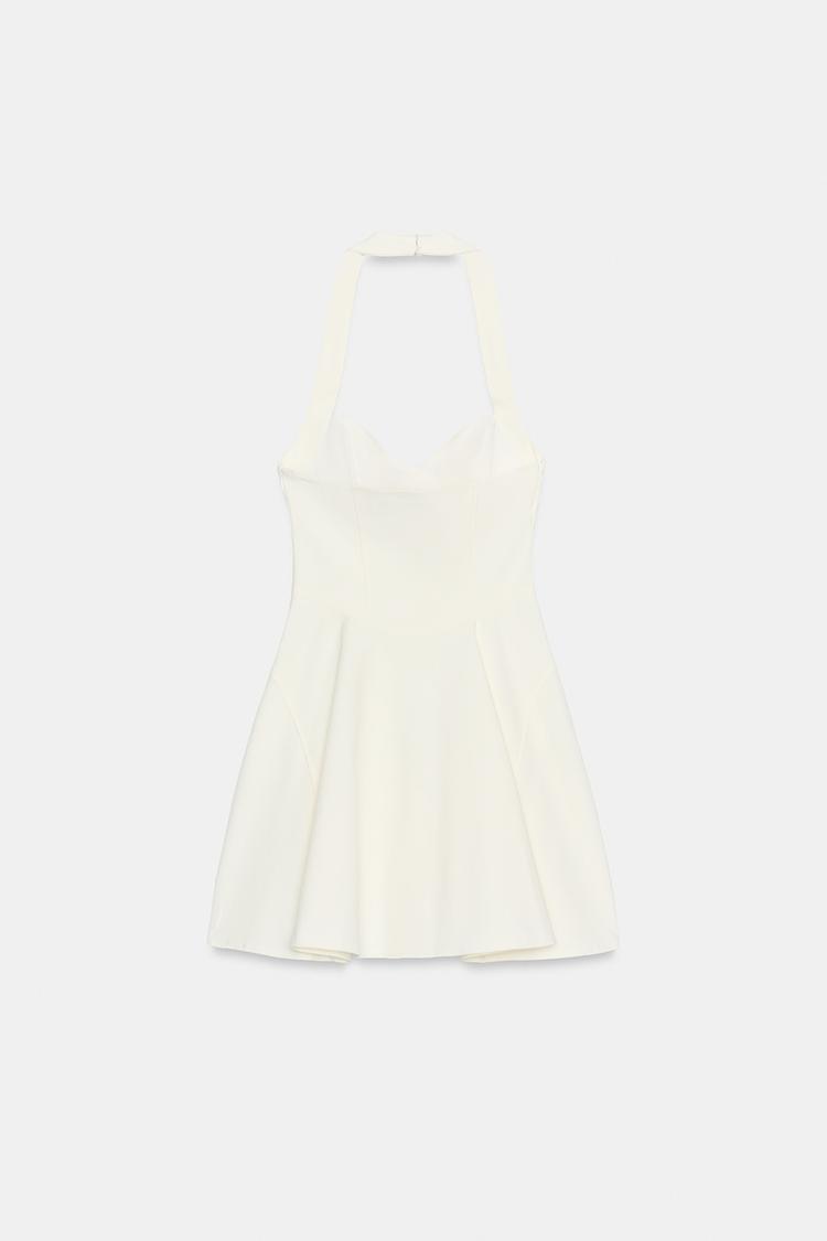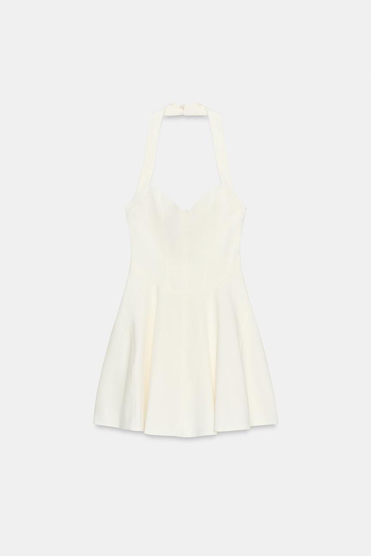 Halter yaka ve kalp yakalı kısa elbise. Belirgin dikiş detaylı. Uyumlu astarlı. Yan tarafı gizli fermuarlı ve yakası gizli düğmeli.