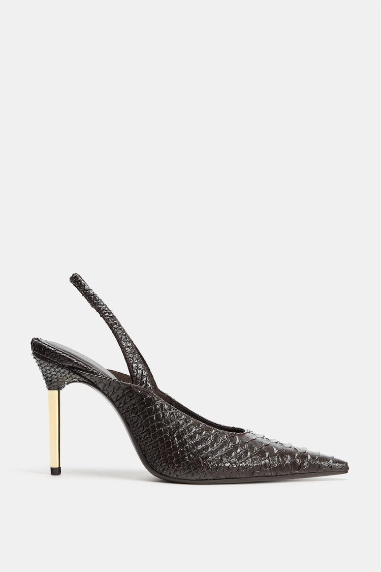 Kabartma efektli topuklu ayakkabı. Arkası elastik parçalı. Metalik efektli yüksek topuklu. Sivri burunlu.