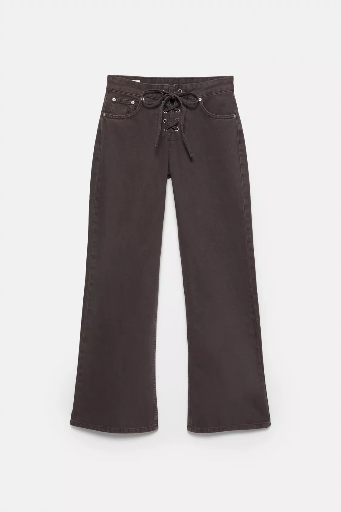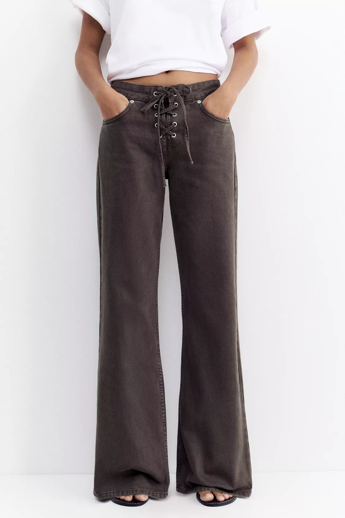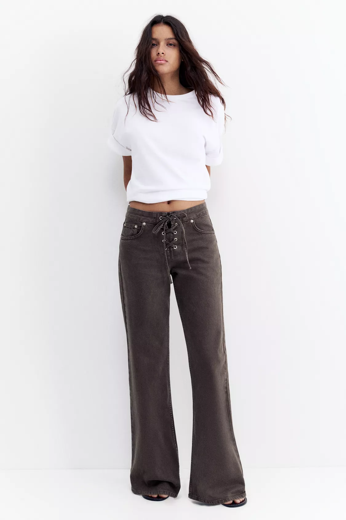 Pamuklu kumaştan üretilmiş, beş cepli ve belinde korsan tarzı bağcık detayları bulunan düşük bel jean.