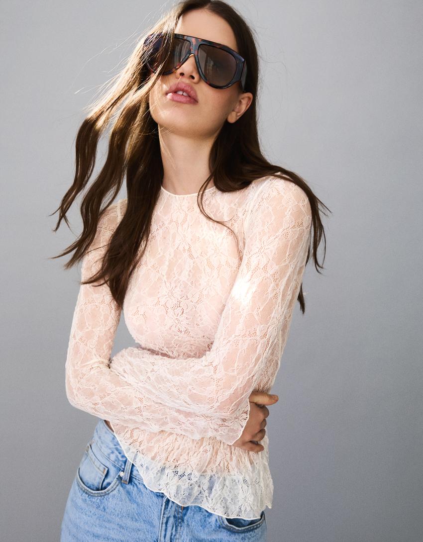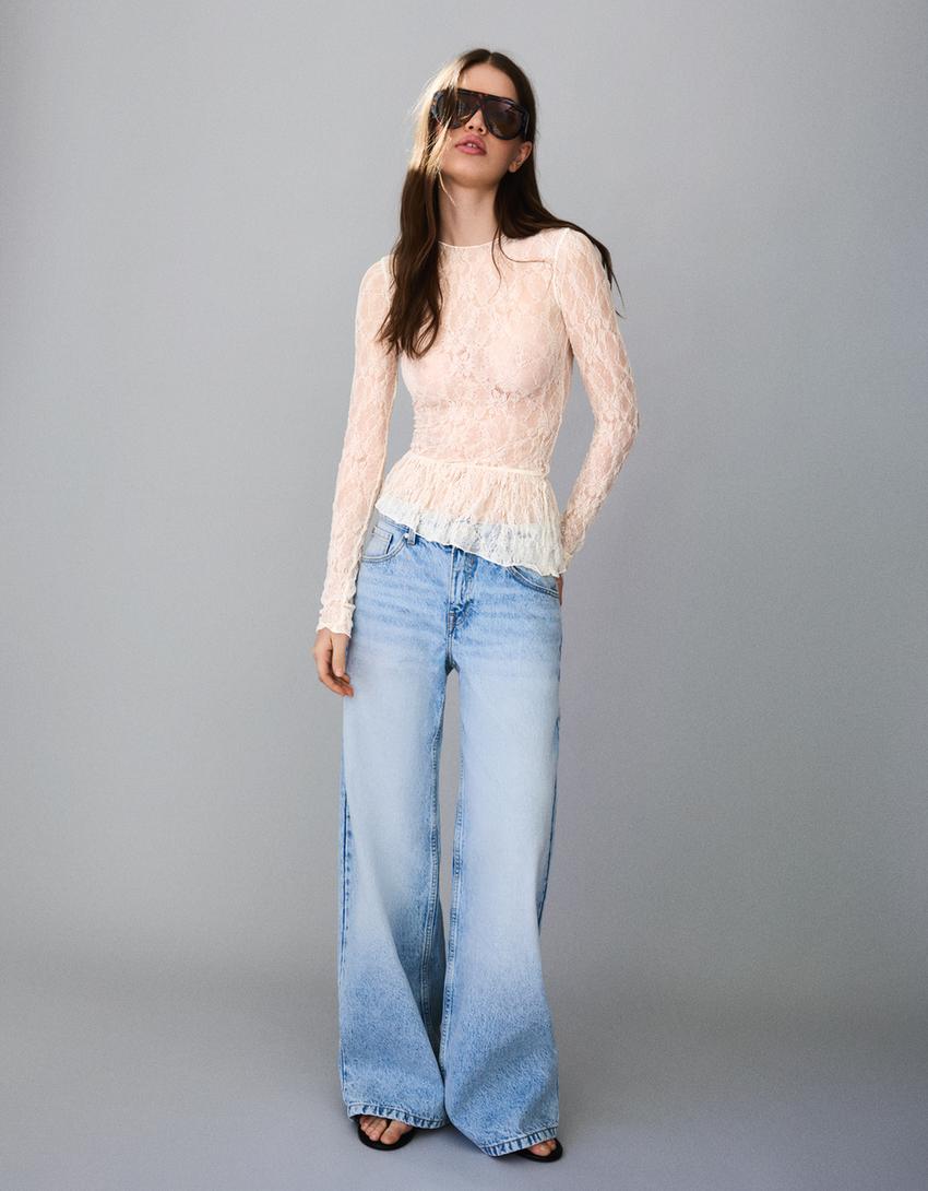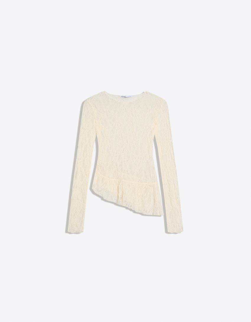 KREM RENGİ FIRFIRLI DANTEL UZUN KOLLU TİŞÖRT