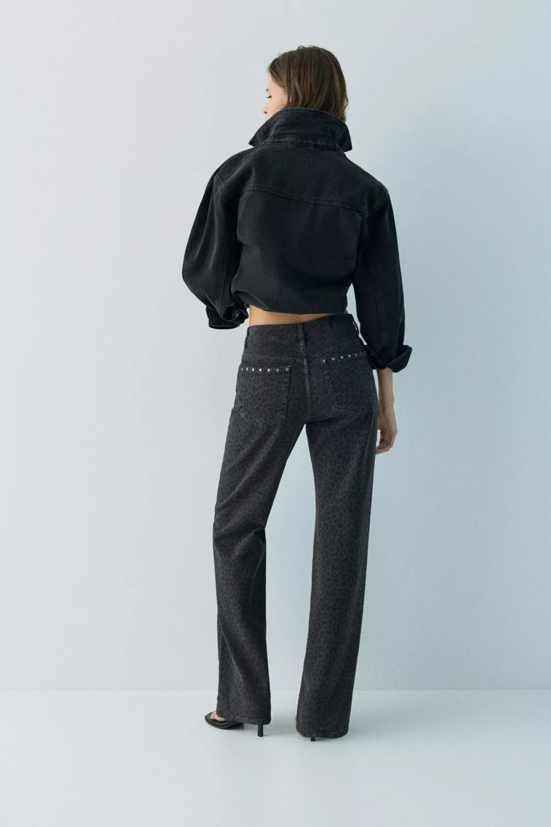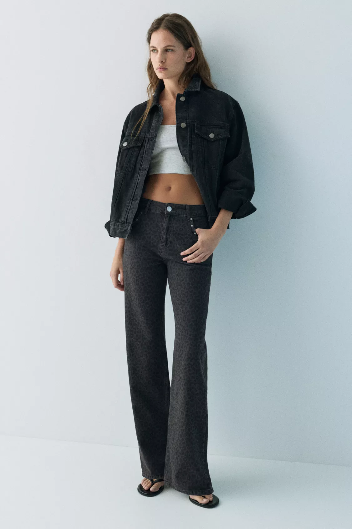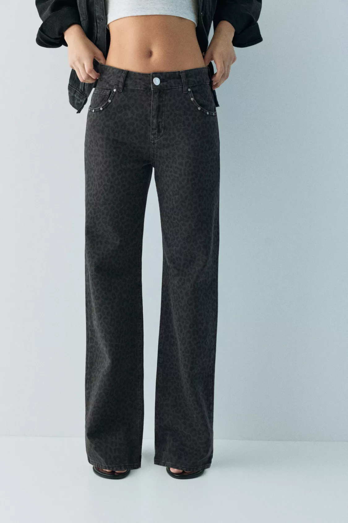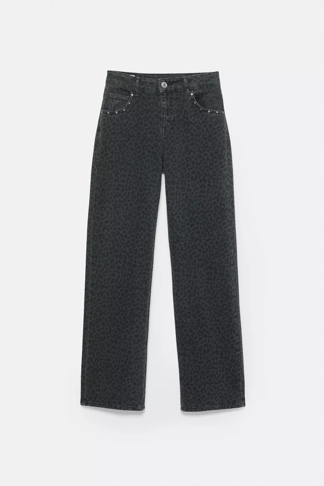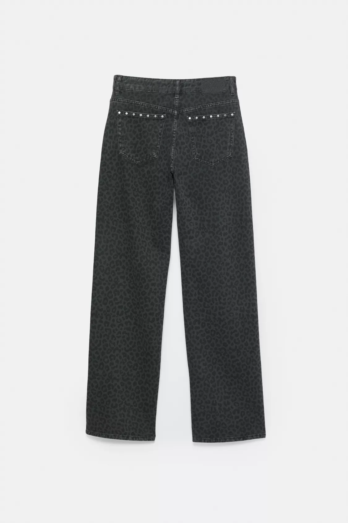 Leopar desenli ve zımba detaylı, beş cepli, kemer köprülü, fermuarlı ve üstü düğmeli, %100 pamuklu kumaştan üretilmiş orta bel baggy jean.