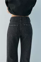 Leopar desenli ve zımba detaylı, beş cepli, kemer köprülü, fermuarlı ve üstü düğmeli, %100 pamuklu kumaştan üretilmiş orta bel baggy jean.