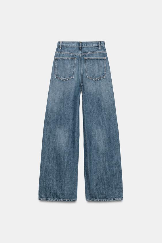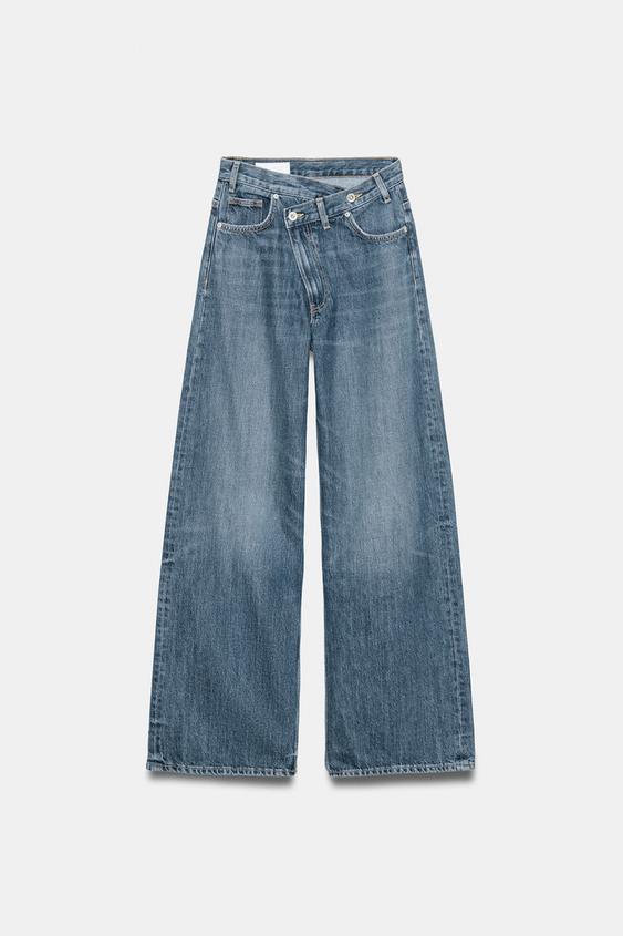 Beş cepli, yüksek bel jean. Ekstra uzun geniş paça. Asimetrik fermuarlı ve metal düğmeli ön kapama.