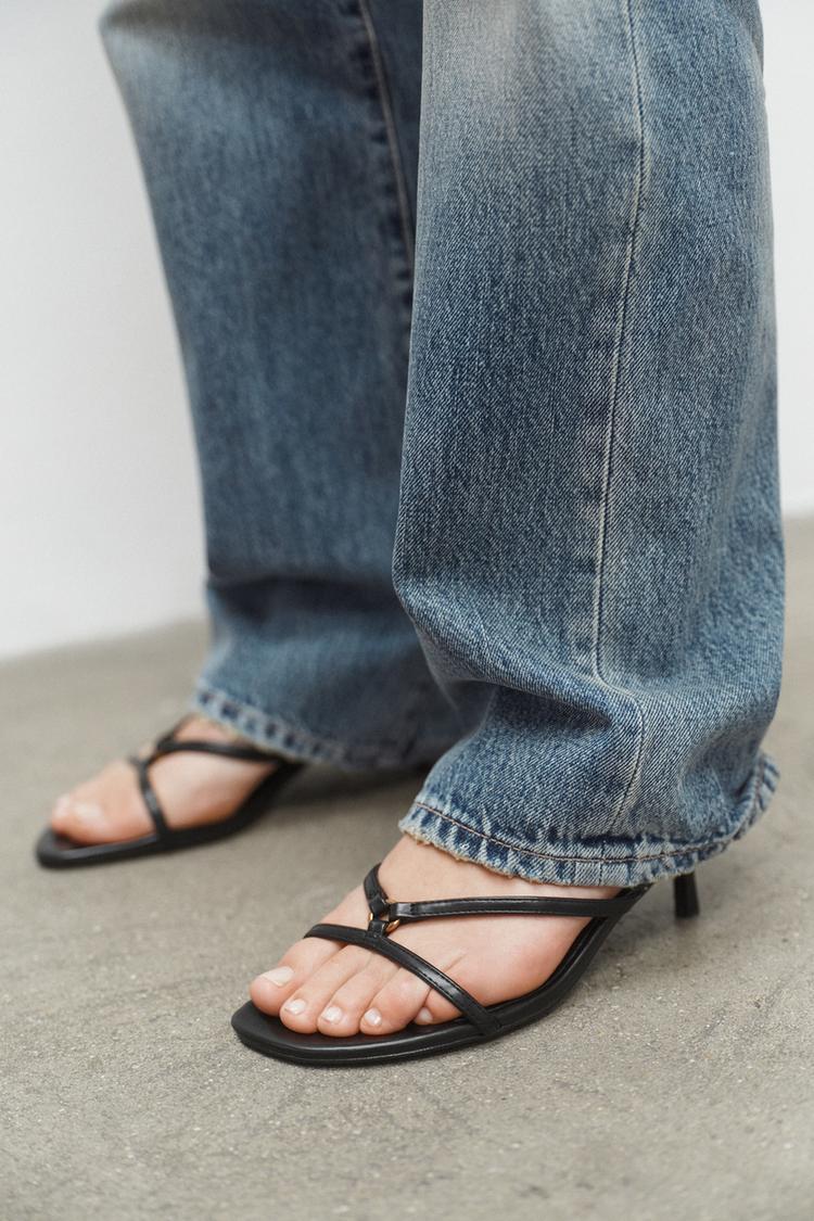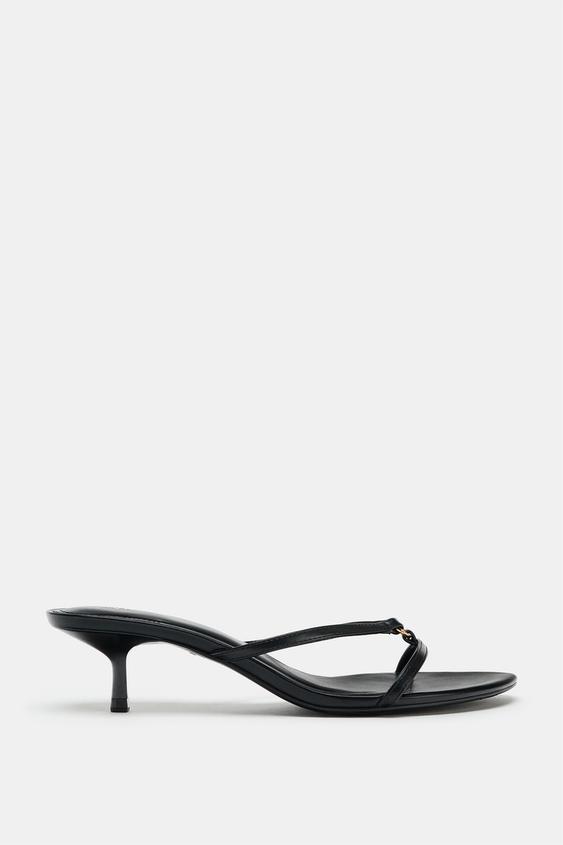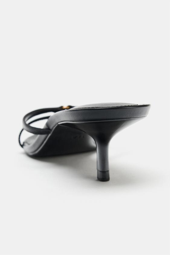 Topuklu sandalet. Çift ön bantlı. Önü metal detaylı. İnce kısa sivri topuklu. Yuvarlak burunlu.