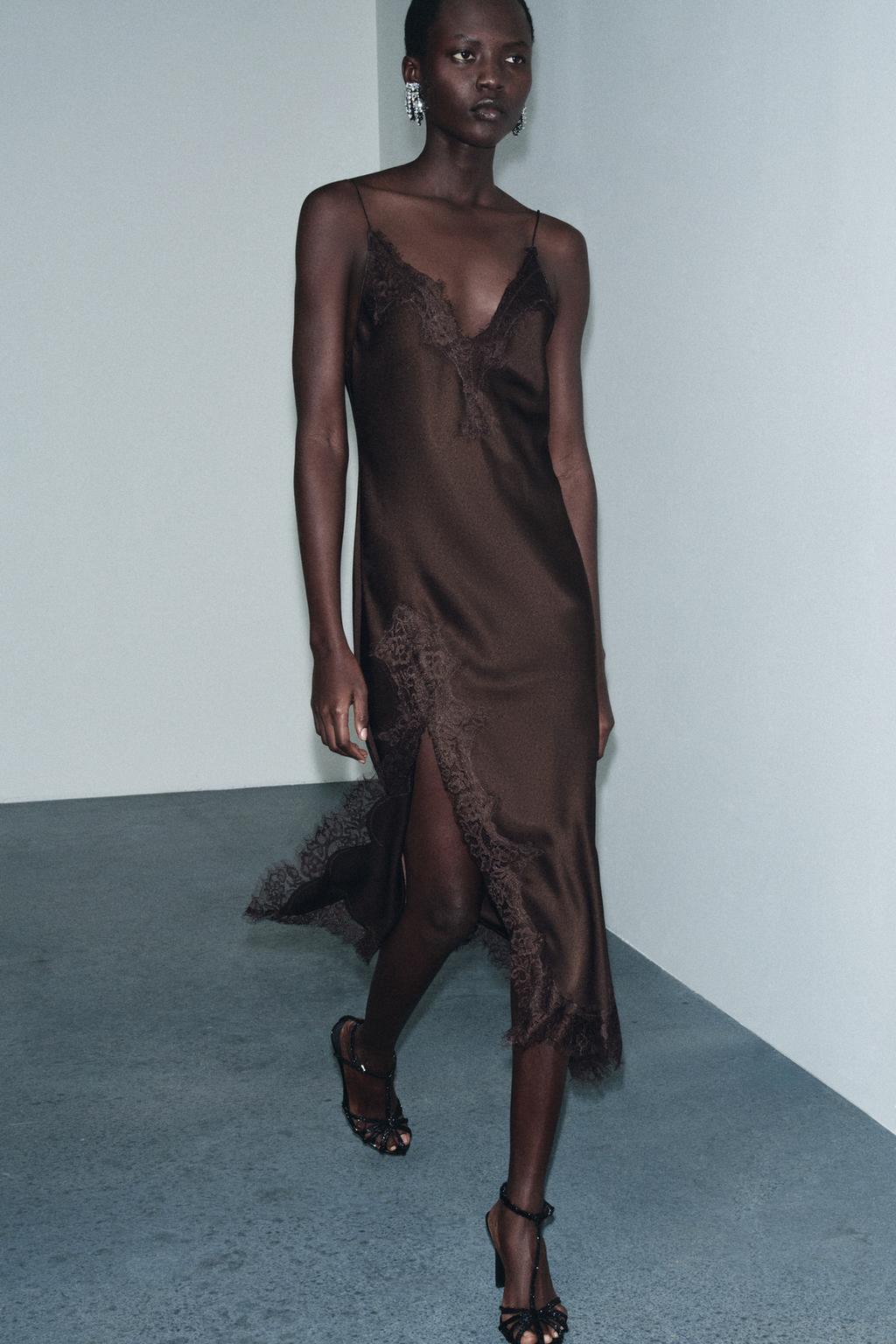 V yaka ve ince askılı, uzun saten yüzeyli elbise. Ton sür ton dantel aplikasyon detaylı. Asimetrik etek ucu.