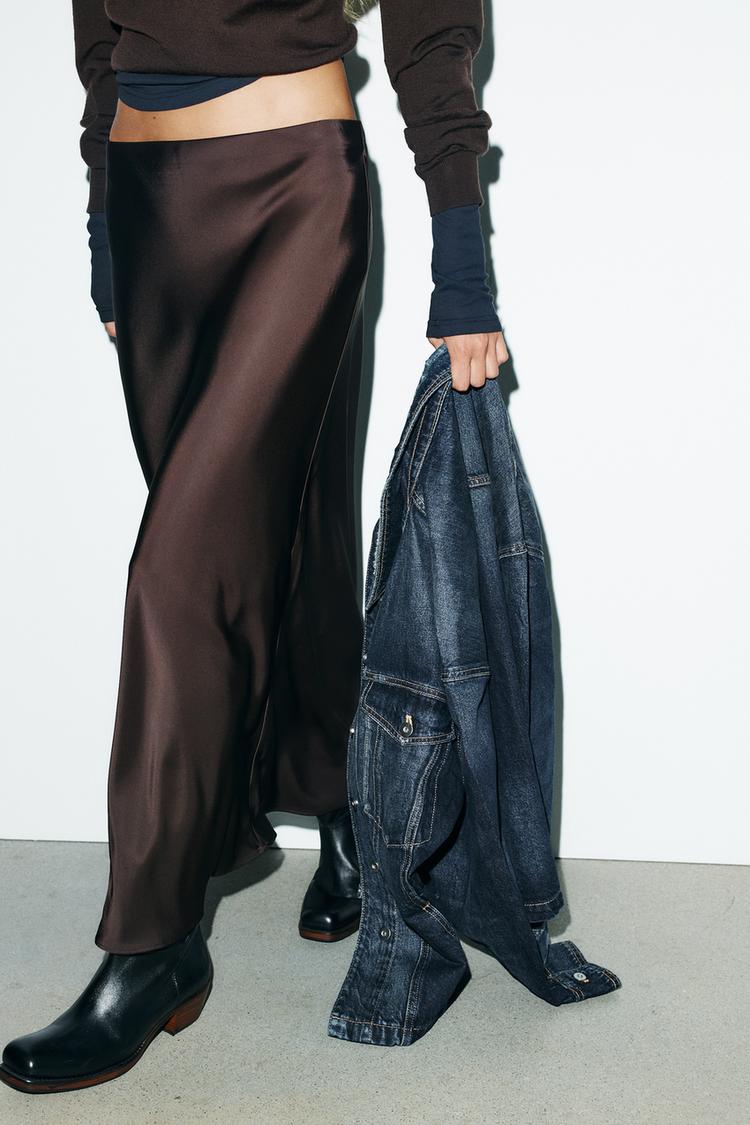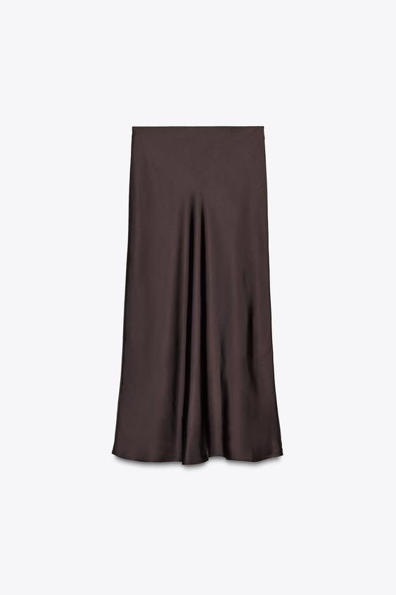 Saten yüzeyli kumaştan üretilmiş midi etek. Yüksek bel ve elastik bel detaylı.