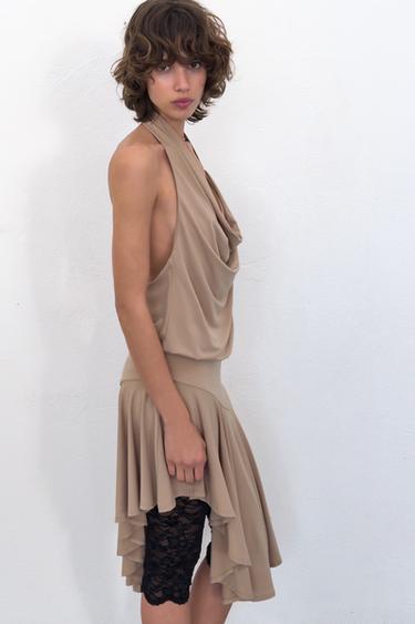 Halter yaka ve drapeli dekolteli elbise. Büzgü detaylı ve sırt dekolteli. Asimetrik etek ucu.