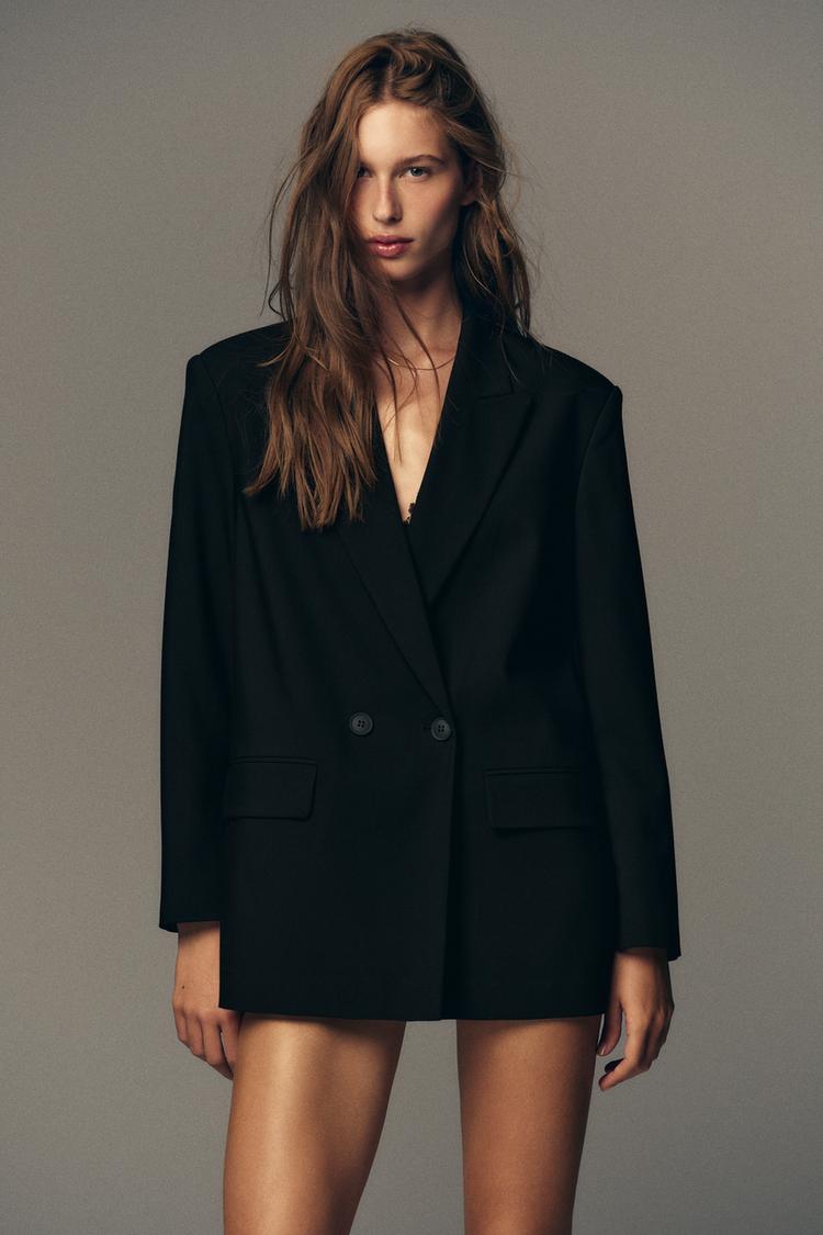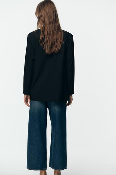 Katlı yaka ve vatkalı uzun kollu, dökümlü blazer. Kapaklı ön cepli ve önü kruvaze düğme iliklemeli.