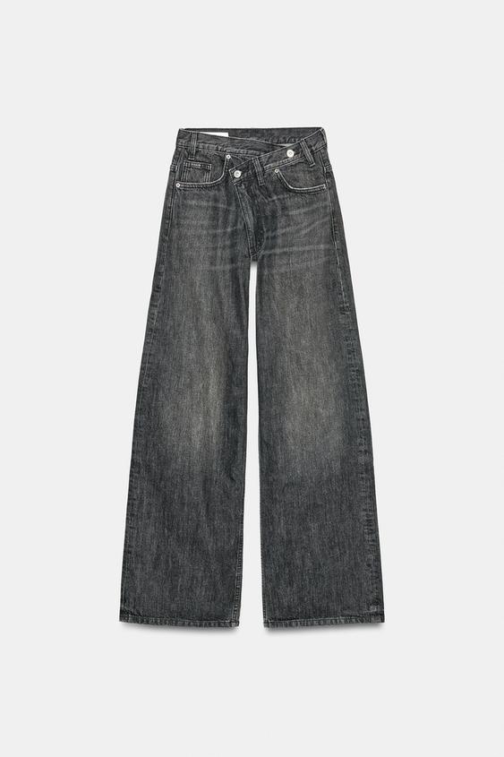 Beş cepli, yüksek bel jean. Ekstra uzun geniş paça. Asimetrik fermuarlı ve metal düğmeli ön kapama.
