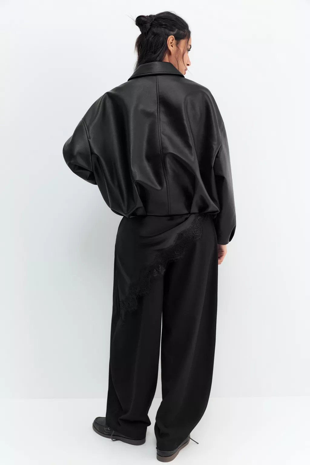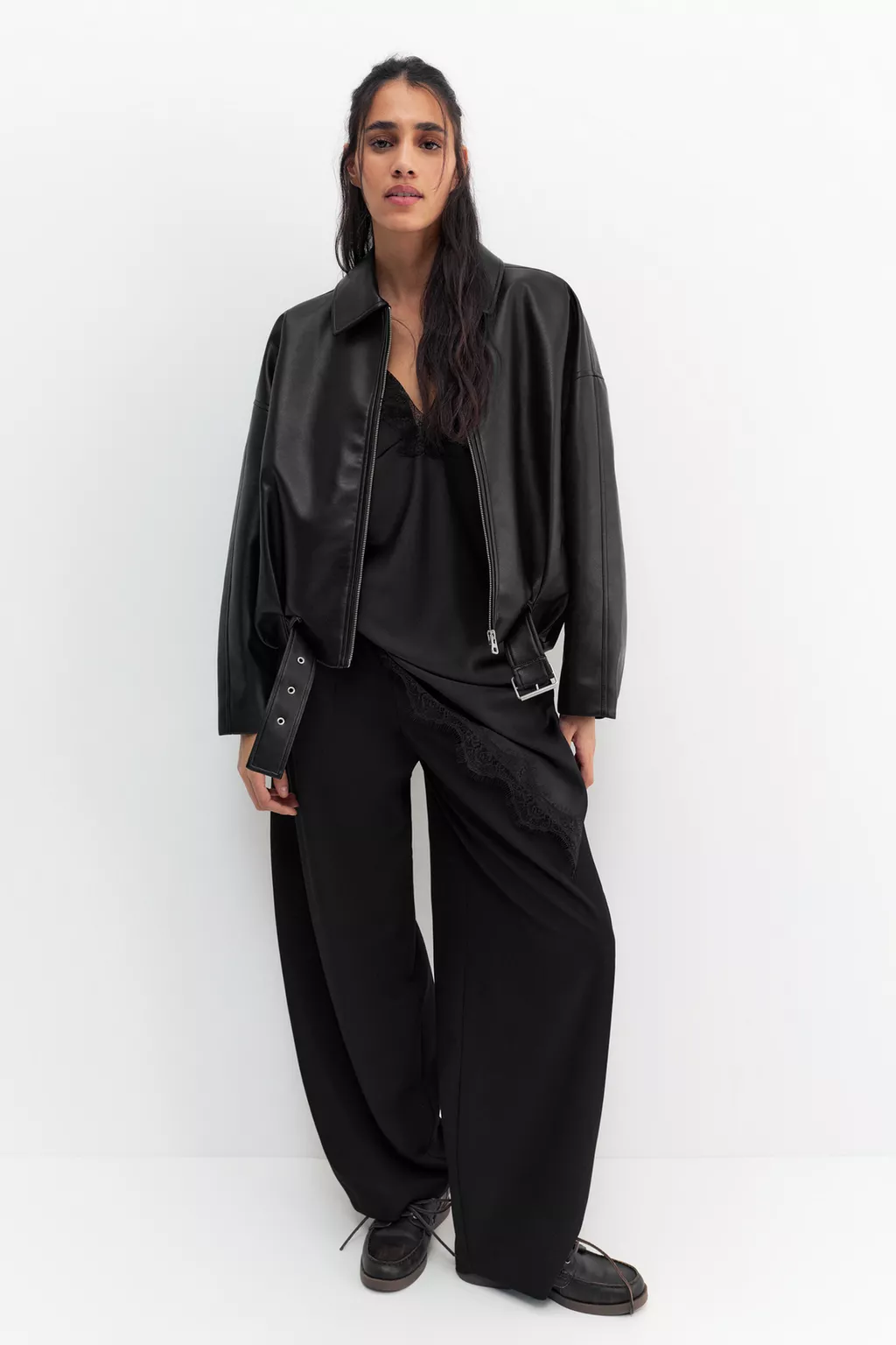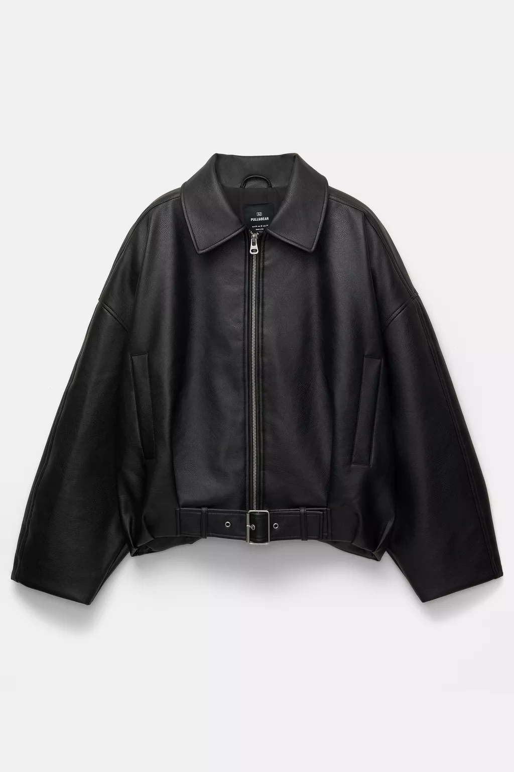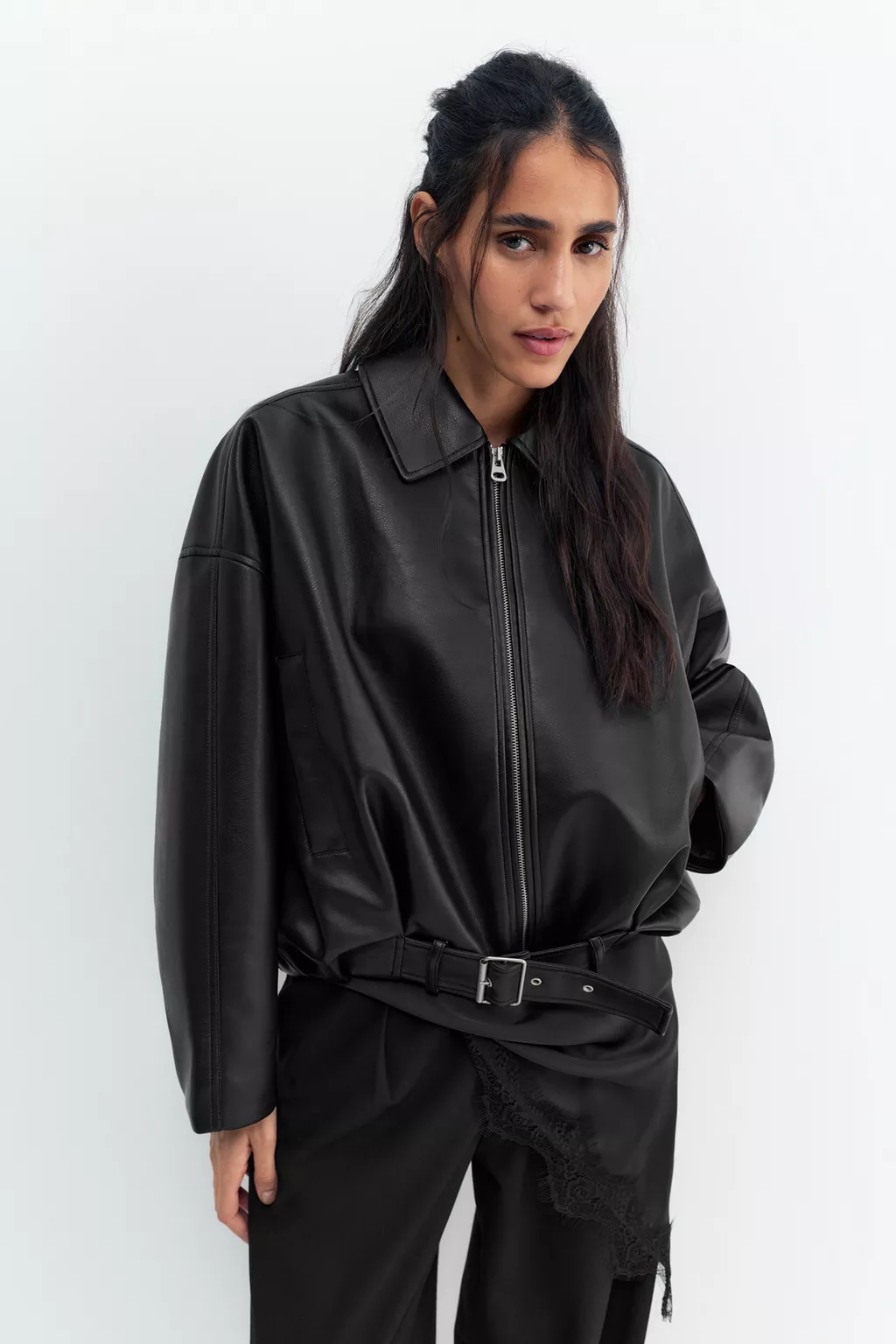 Yan cepli, fermuarlı ve etek ucu tokalı kemerli, suni deri balon silüet bomber ceket.