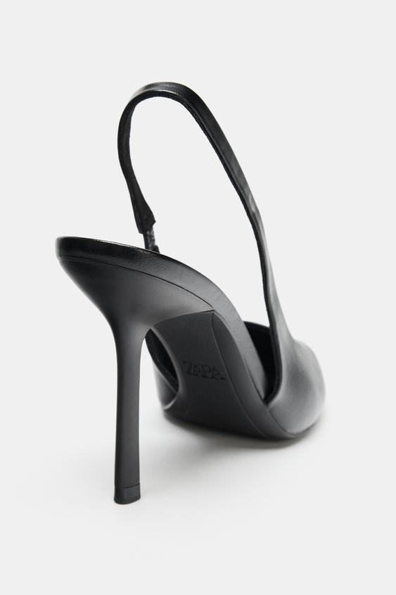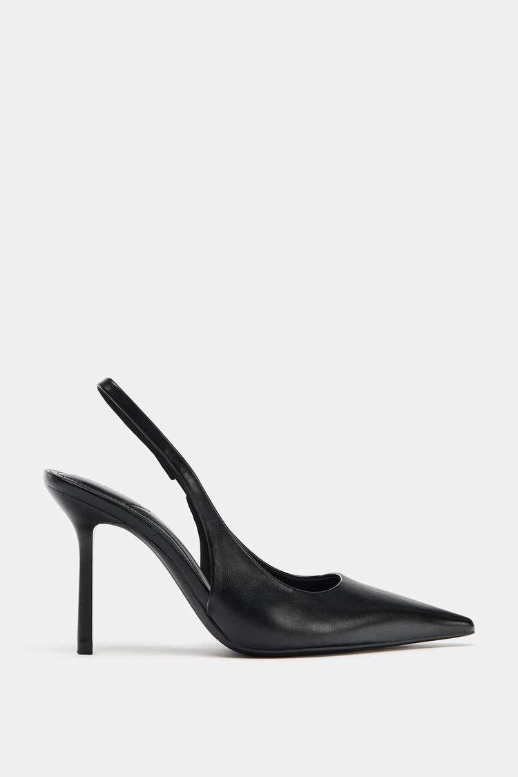 Topuklu arkası açık ayakkabı. Arkası elastik parçalı ince bant. İnce yüksek topuklu. Sivri burunlu.