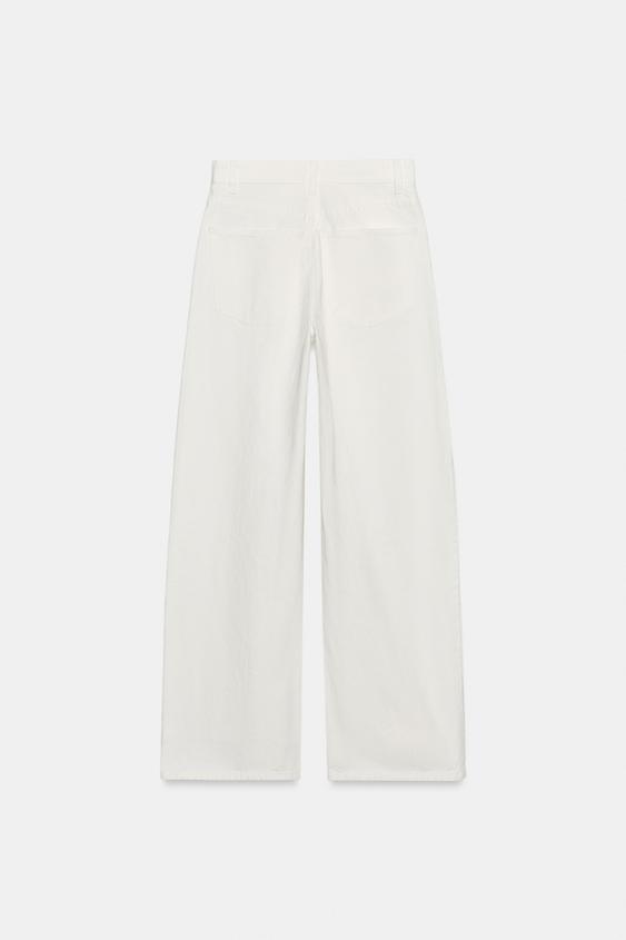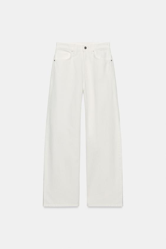 Fermuarlı ve metal düğmeli, beş cepli, yüksek bel, ekstra uzun geniş paça jean.