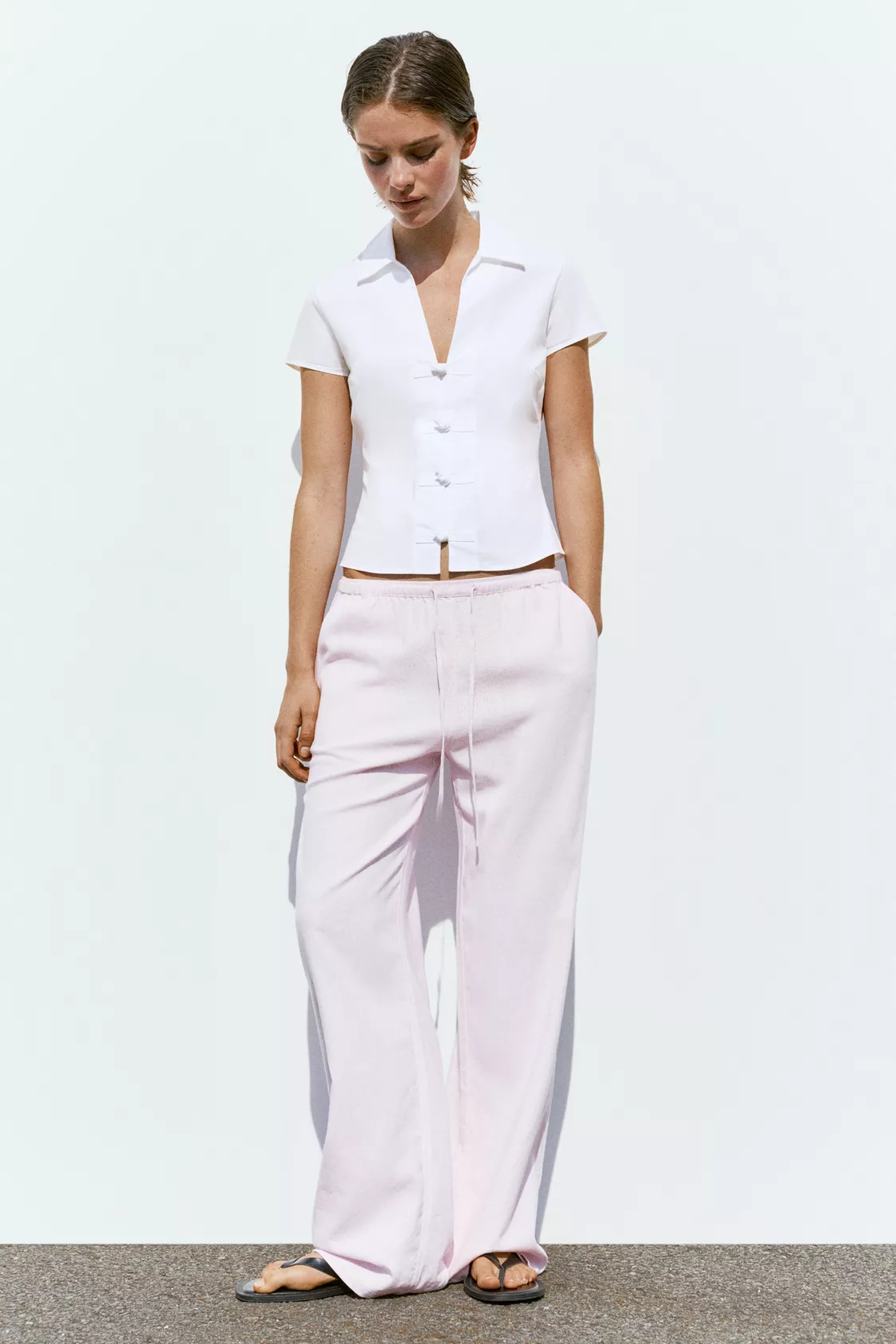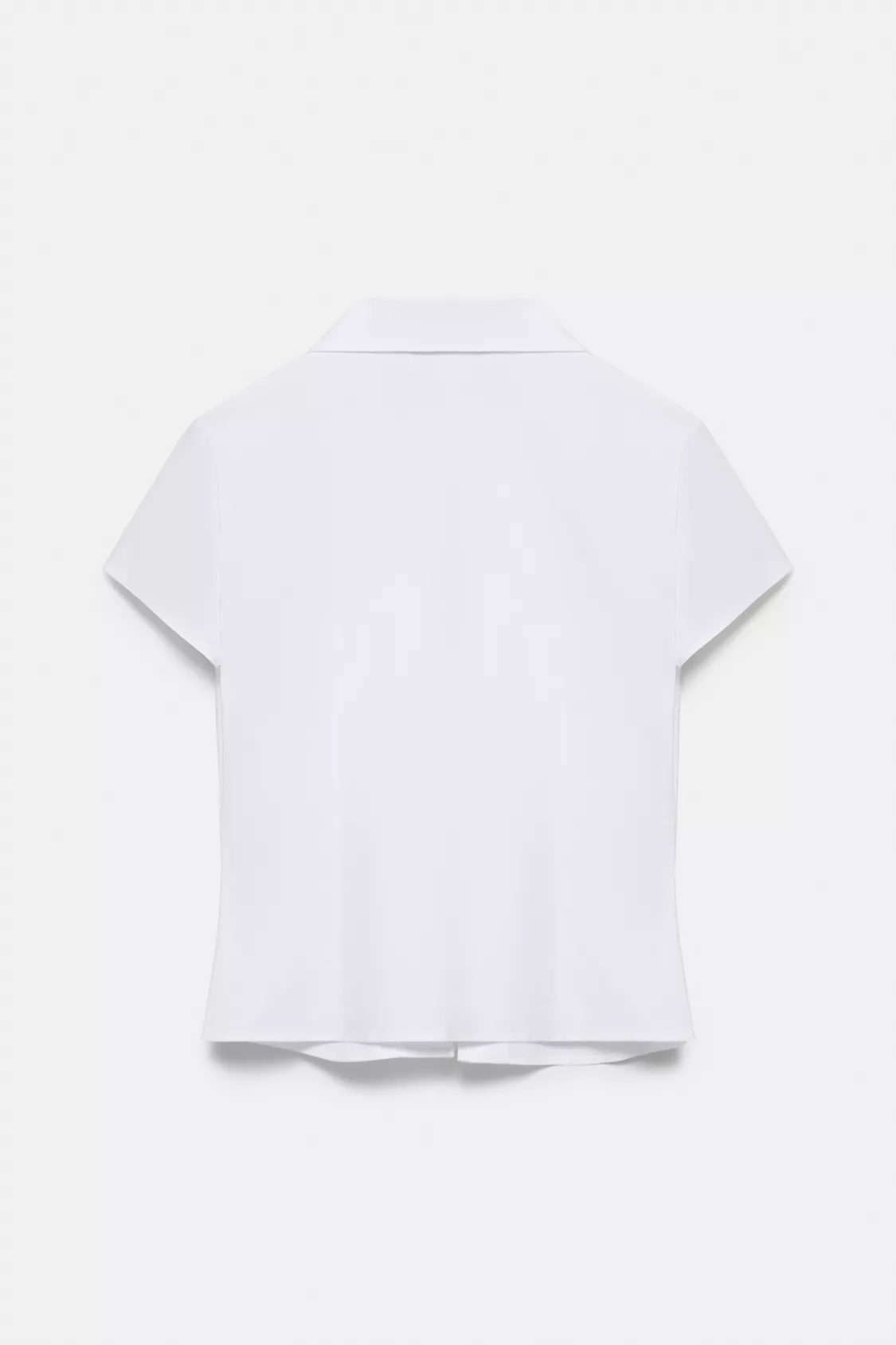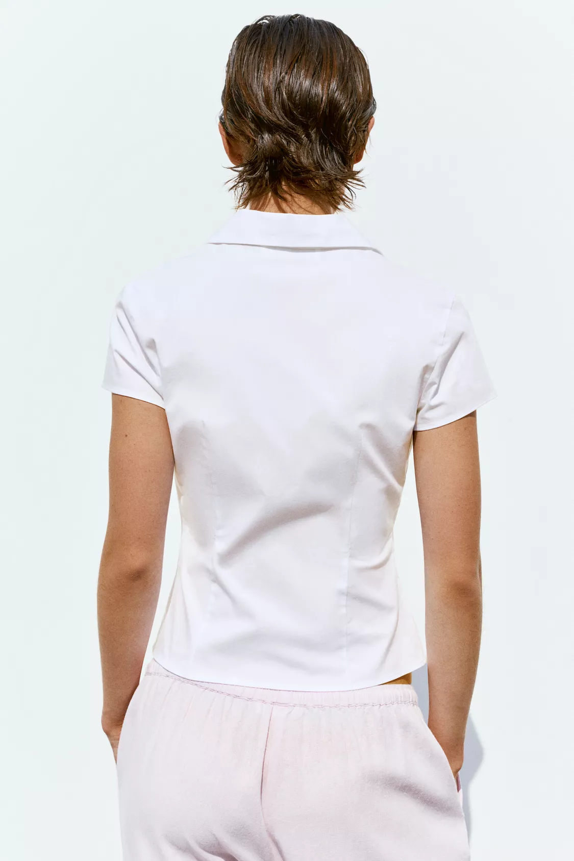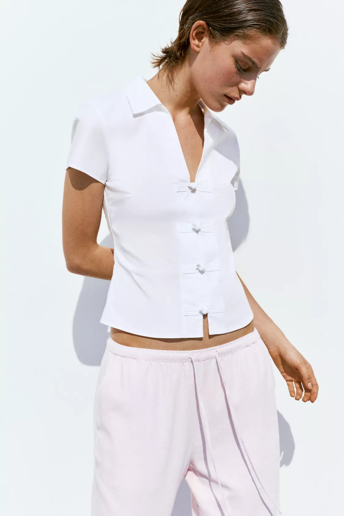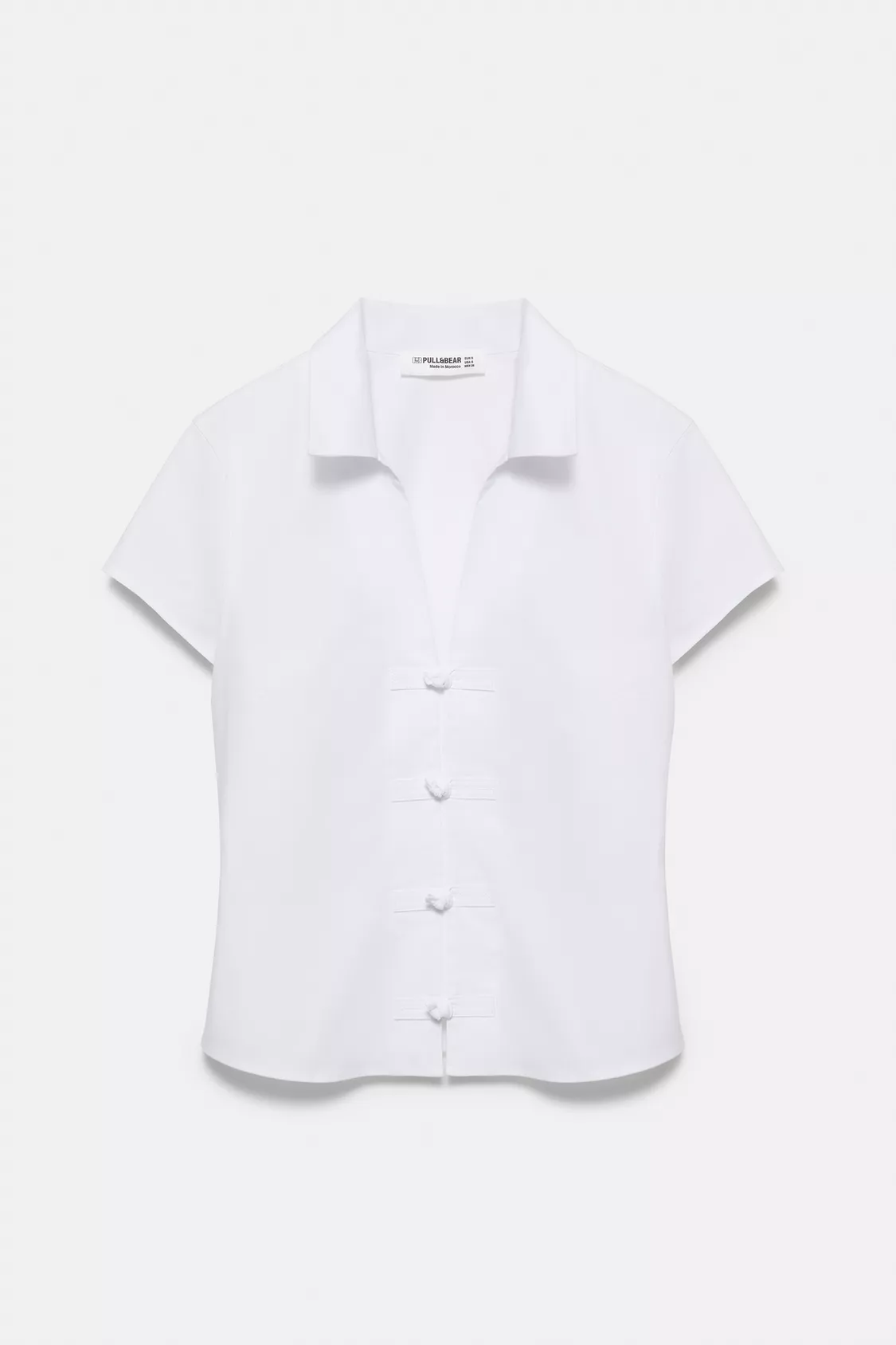 Hafif esnek pamuklu kumaştan, süslü düğmeli, kısa kollu, dar kesim gömlek.