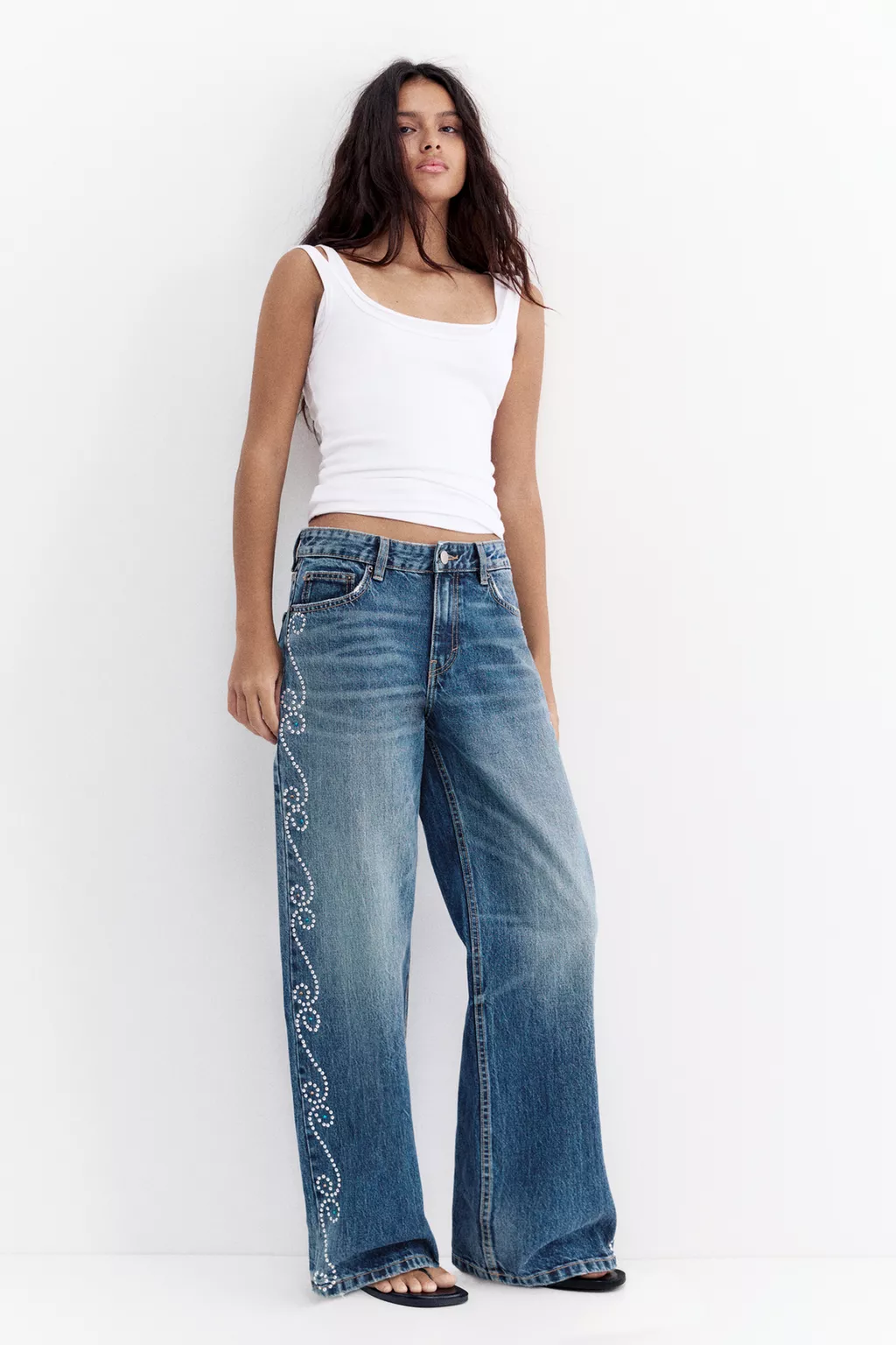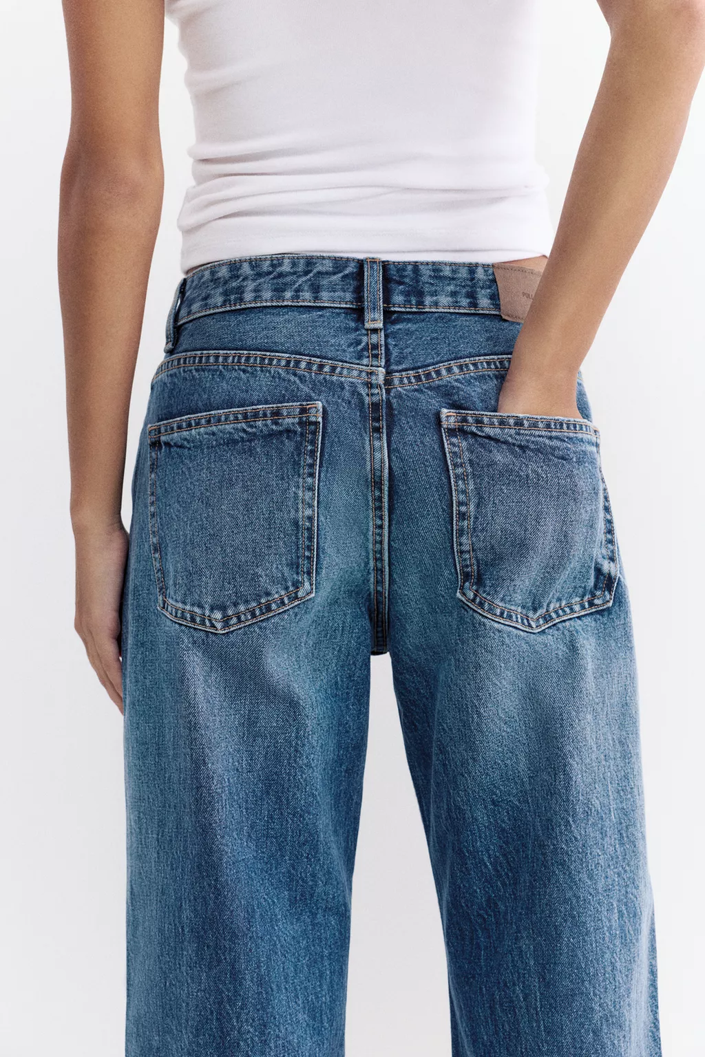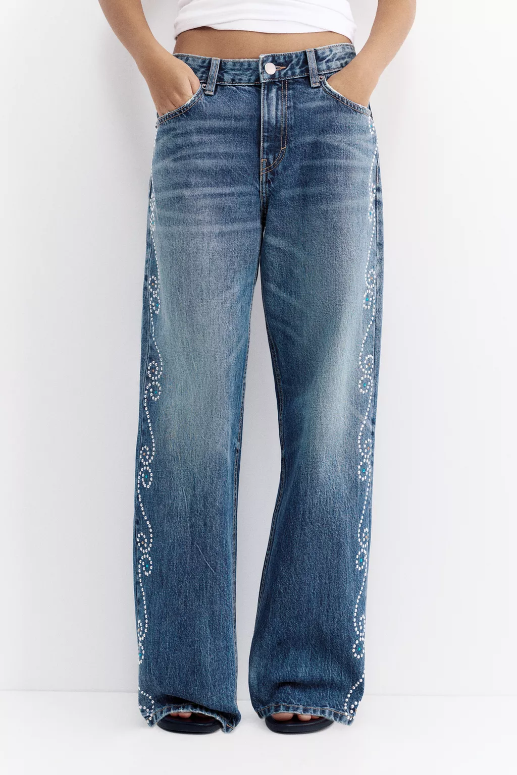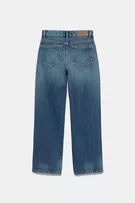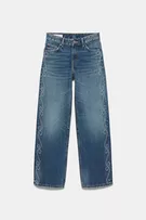 Yandan zımba detaylı, beş cepli, kemer köprülü, düğmeli ve fermuarlı, pamuklu, orta bel, düz kesim jean.